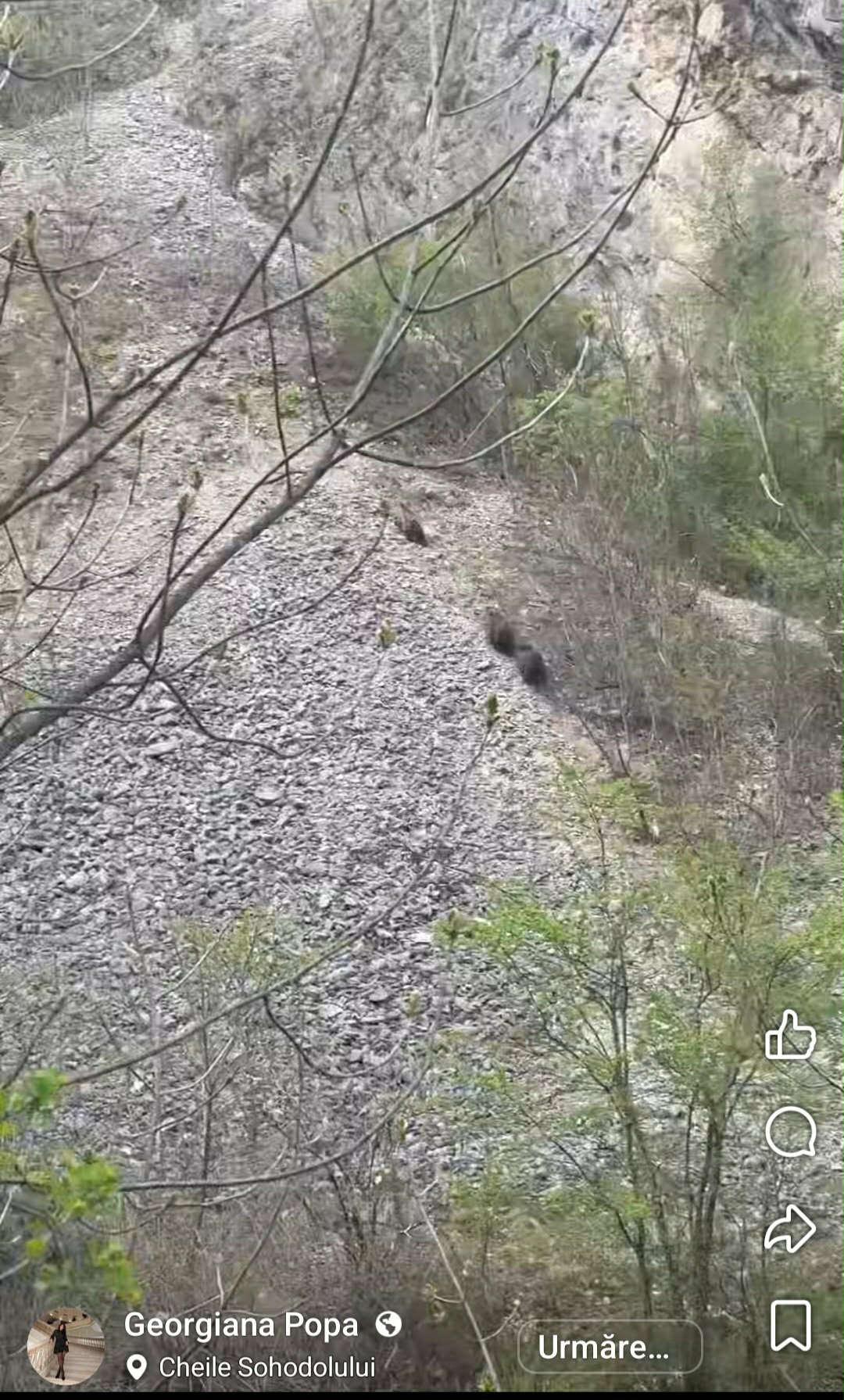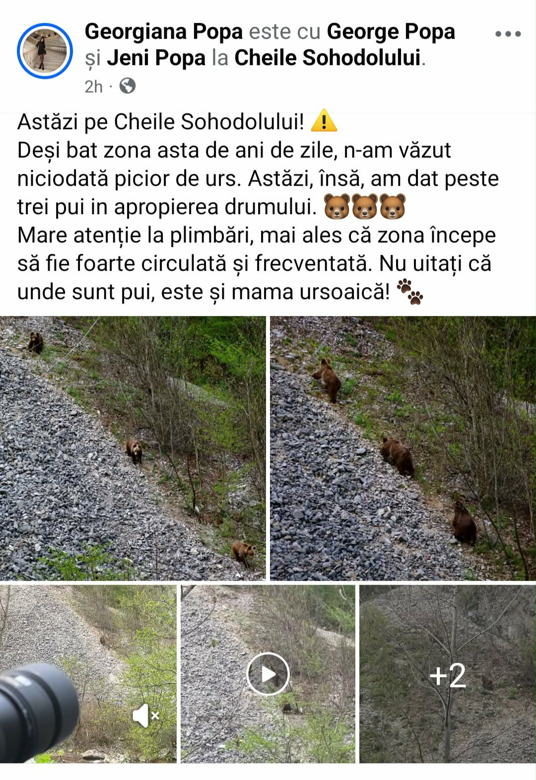 Pui de urs suprinși, luni, pe Cheile Sohodolului, de Georgiana Popa, o tânără din Târgu Jiu. Aceasta a prezentat pe pagina de socializare, într-o postare publică, imagini și filmări, precum și o avertizare:
