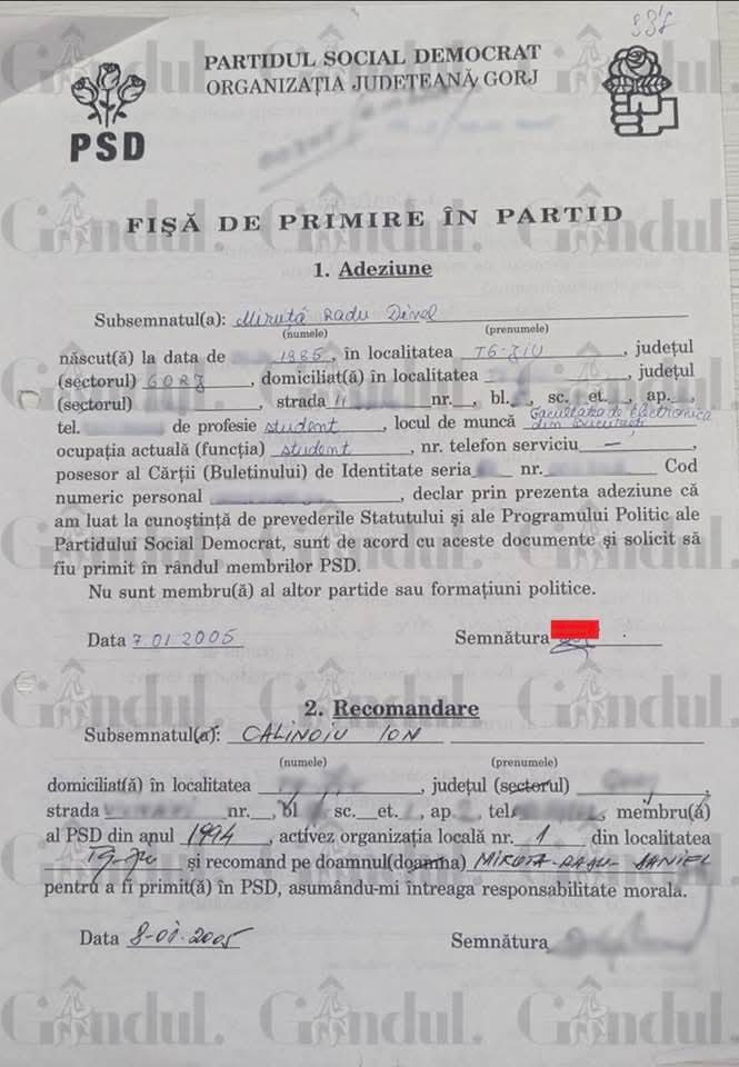 Radu Miruță, vicepremier, ministru a Apărării și lider al USR Gorj, a semnat o adeziune la PSD Gorj la data de 7 ianuarie 2005, pe când era student, arată Un document prezentat de gandul.ro.