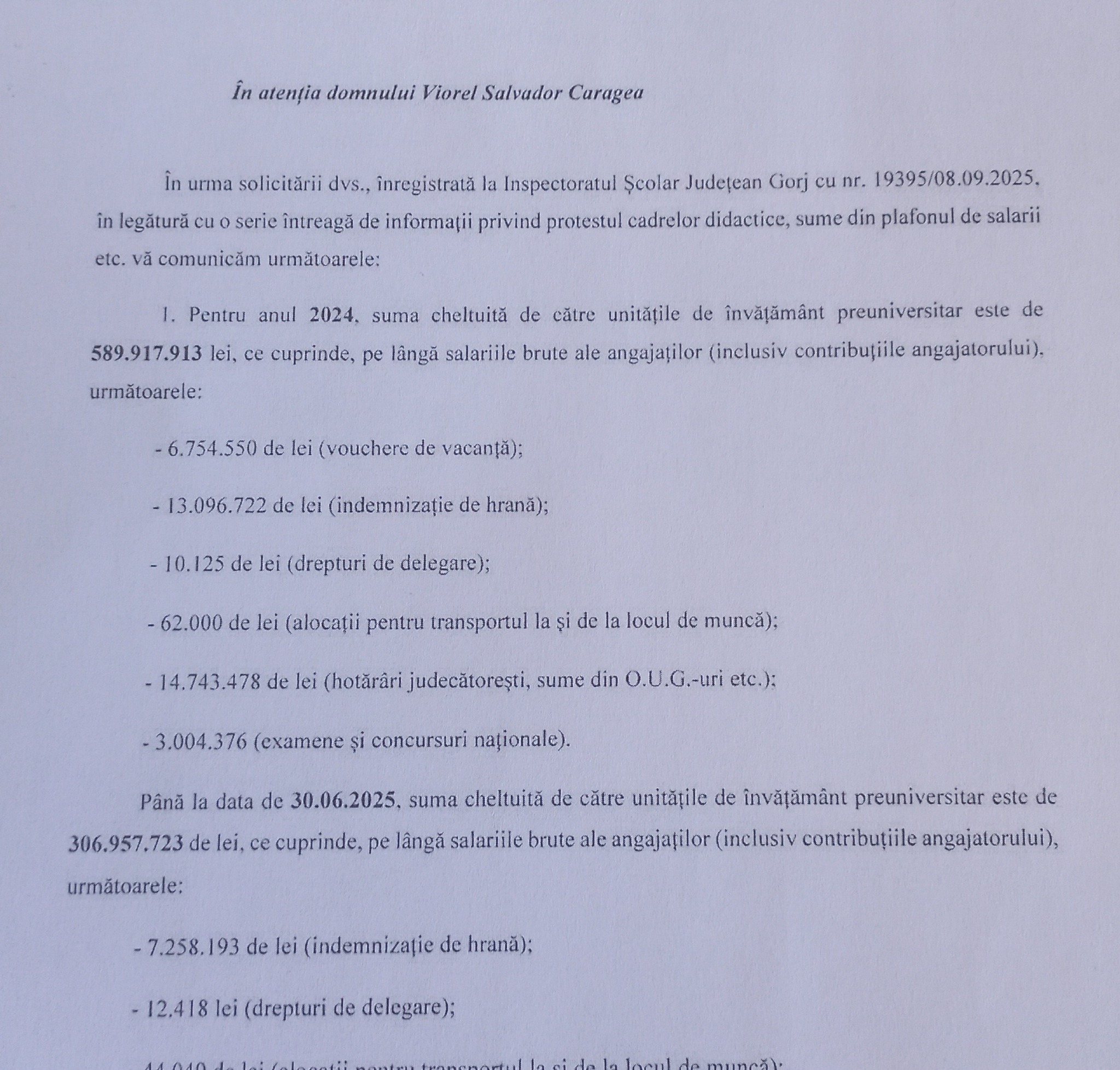 Viorel Caragea, fost inspector-șef al IPJ Gorj, prezintă un document în care arată că, în 2024, au fost alocate aproape 110 milioane de euro pentru achitarea drepturilor salariaților din învățământul preuniversitar gorjean.