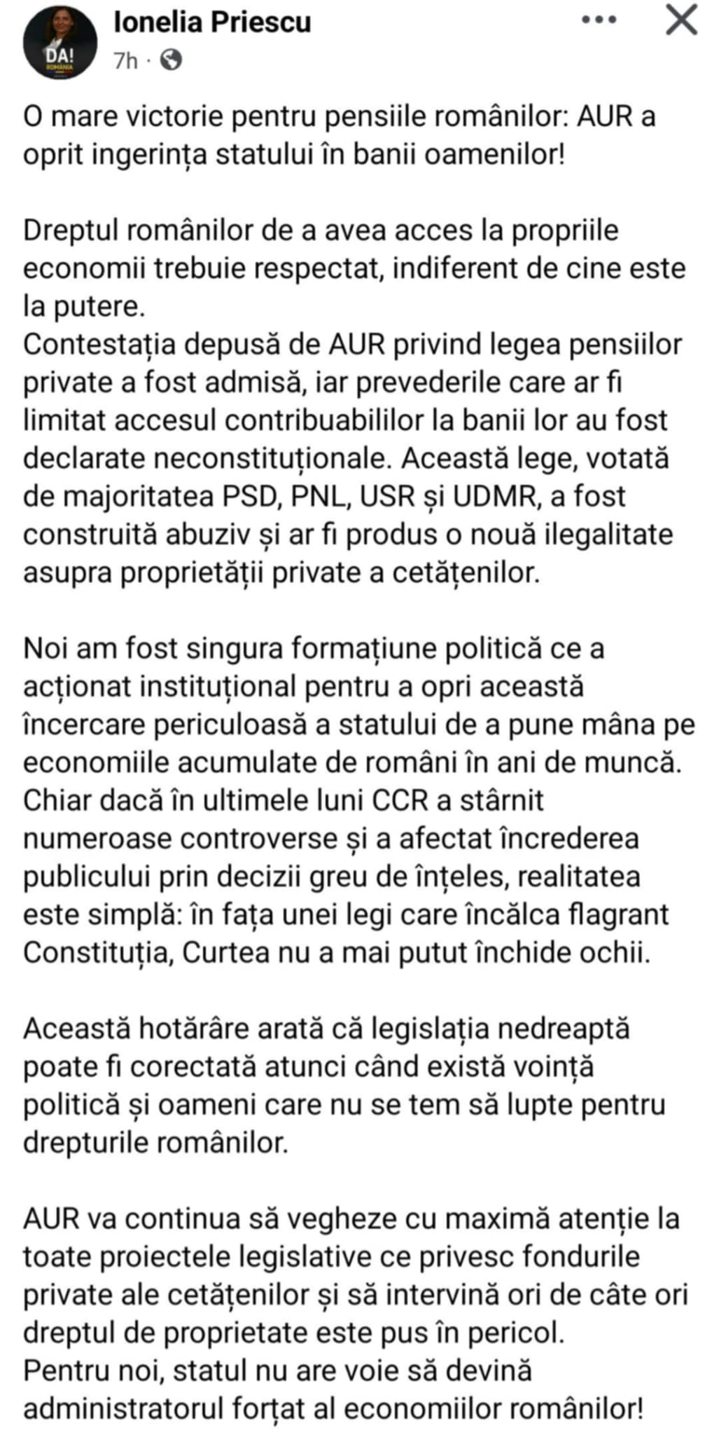 ”O mare victorie pentru pensiile românilor: AUR a oprit ingerința statului în banii oamenilor! Dreptul românilor de a avea acces la propriile economii trebuie respectat, indiferent de cine este la putere Contestația depusă de AUR privind legea pensiilor private a fost admisă, iar prevederile care ar fi limitat accesul contribuabililor la banii lor au fost declarate neconstituționale. Această lege, votată de majoritatea PSD, PNL, USR și UDMR, a fost construită abuziv și ar fi produs o nouă ilegalitate asupra proprietății private a cetățenilor. Noi am fost singura formațiune politică ce a acționat instituțional pentru a opri această încercare periculoasă a statului de a pune mâna pe economiile acumulate de români în ani de muncă. Chiar dacă în ultimele luni CCR a stârnit numeroase controverse și a afectat încrederea publicului prin decizii greu de înțeles, realitatea este simplă: în fața unei legi care încălca flagrant Constituția, Curtea nu a mai putut închide ochii.