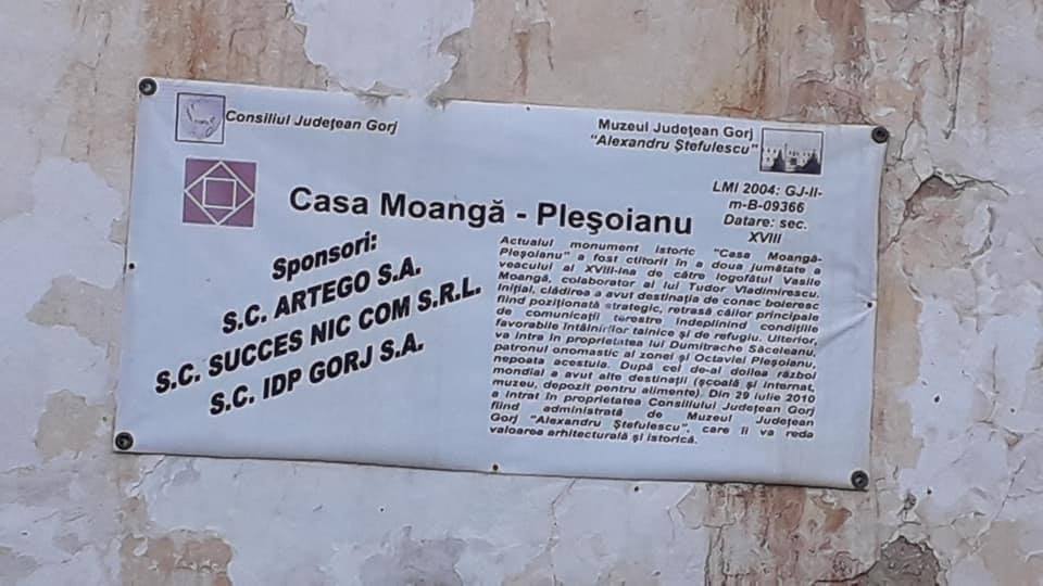 Nu sunt bani. Aceeași placă zgâriată, arhicunoscutul refren venit drept argument-scuză în nerezolvarea problemelor. Zeci de monumente istorice din Gorj sunt lăsate în ruină, din cauza lipsei de finanțare. În aceeași situație, și Casa Moangă Pleșoianu de la Săcelu, preluată în anul 2010 de Consiliul Județean Gorj de la admnistrația locală tocmai pentru a fi salvată. S-a estimat că monumentul istoric este distrus în proporție de 90% și sunt necesare 3 miliarde de lei vechi pentru reabilitarea construcției. Dumitru Hortopan, directorul Muzeului Județean Gorj ”Alexandru Ștefulescu”, instituție care are în administrare casa, spunea la acea vreme că se impune un acoperiș provizoriu, iar în 2011 monumentul o să fie inclusă în Programul Național de Restaurare. ”Vom face acolo un muzeu despre cultura și civilizația locală cu obiecte de geologie, arheologie, istorie. De asemenea, vor exista și două camere de protocol pentru oaspeții Muzeului Județean”, preconiza Hortopan. Au trecut opt ani de la preluarea de către Consiliul Județean și nici urmă de materializare a declarațiilor directorului de la muzeul din Târgu Jiu. A fost improvizat un acoperiș din covoare de cauciuc, însă anii care au trecut nu l-au iertat nici pe el. Nu sunt bani, specialiștii spun că bugetele locale și județene sunt insuficiente pentru restaurarea monumentelor de categorie B, iar fondurile europene se accesează foarte greu în domeniu. Casa Moangă Pleșoianu a fost construită în anul 1762, proprietate a logofătului Vasile Moangă. Este o casă tip culă, aceasta fiind o fortăreață de apărare. În negurile istoriei a fost refugiu pentru Tudor Vladimirescu și pandurii săi. Peste ani a devenit proprietatea lui Dumitrache Săceleanu și apoi a nepoatei acestuia, Octavia Pleșoianu.
