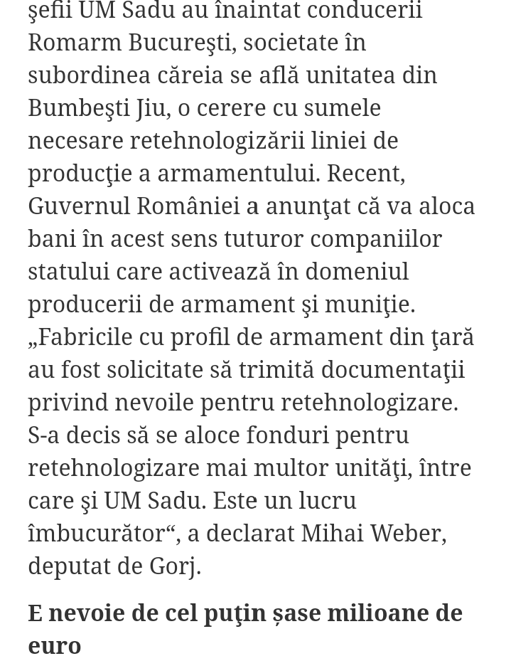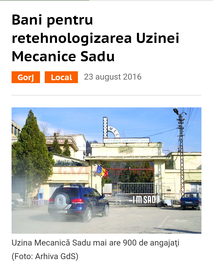 Deputatul Mihai Weber tot rezolvă din gură problemele de la Uzina Mecanică Sadu, dar nu se prea lasă nimic în urma sa. Acesta, în decursul anilor, prin prisma funcțiilor deținute în parlament, a vorbit despre un amplu proces de modernizare și retehnologizare la UM Sadu, a spus că Guvernul României va aloca banii necesari. Vorbe, zilele trecute protejatul lui Liviu Dragnea a ieșit în media locală și prezentat ca posibilă rezolvare a neajunsurilor tehnologice de la Sadu preluarea unei linii de producție de la o unitate de profil din județul Alba, și anume UM Cugir. Concret, Weber anunța aducerea echipamentului la Bumbești Jiu. Primarul localității, Constantin Bobaru, nu consideră transferul tehnologic anunțat drept o realizare.