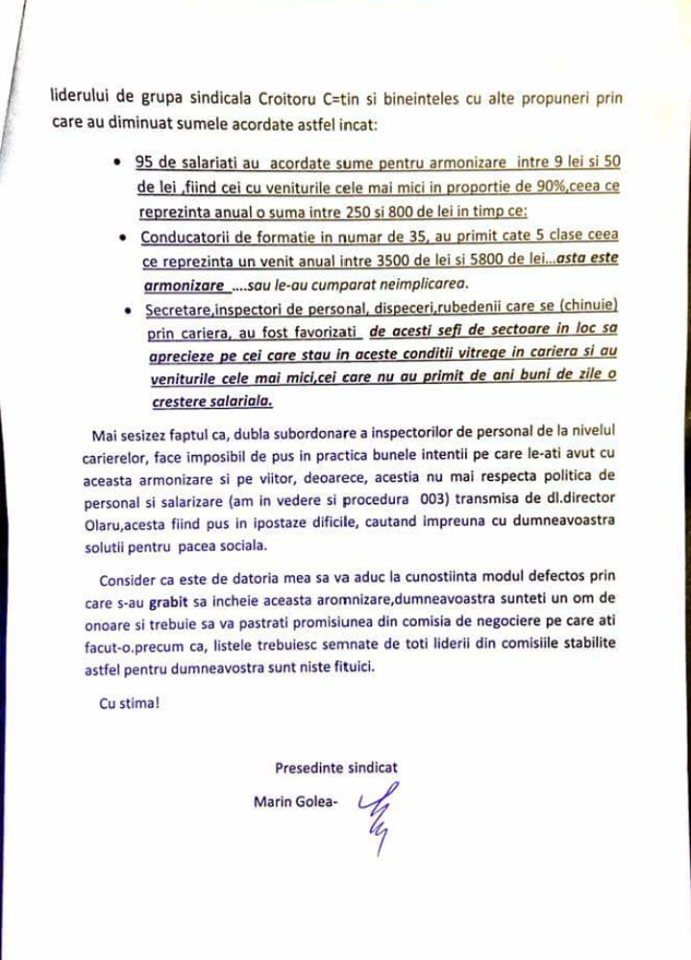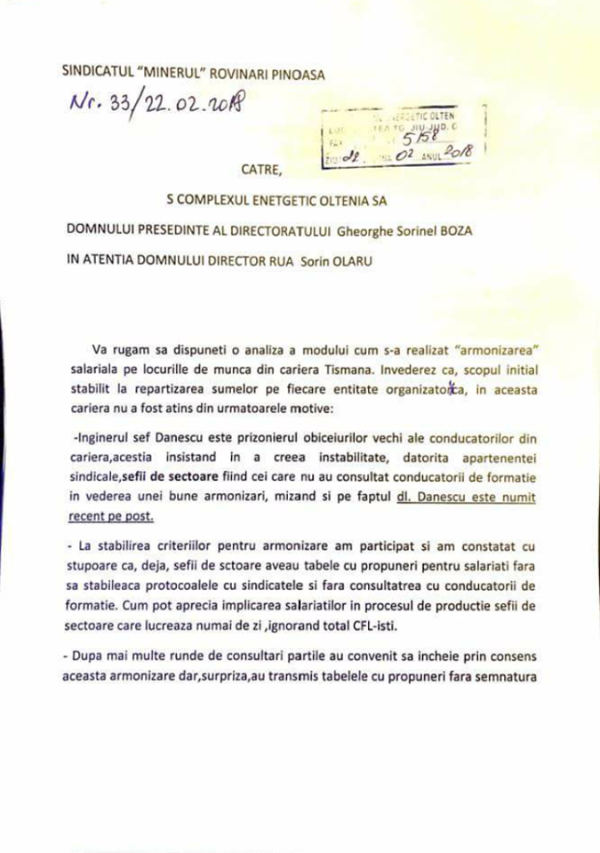 ”La stabilirea criteriilor pentru armonizare am participat și am constatat cu stupoare că deja șefii de sectoare aveau tabelele cu propuneri pentru salariați, fără să stabilească protocoale cu sindicatele și fără consultarea cu conducătorii de formație. Cum pot aprecia implicarea salariaților în procesul de producție șefii de sectoare, care lucrează numai de zi?. Secretare, inspectori de personal, dispeceri, rubedenii care se (chinuie) prin carieră au fost favorizați de acești șefi de sectoare, în loc să îi aprecieze pe cei care stau în condiții vitrege în carieră și au venitule cele mai mici, cei care nu au primit de ani buni o creștere salarială”, semnalează administrației CEO, în scris, Marin Golea. Acesta mai spune că tabelele cu propuneri au fost transmise fără semnătura liderului de grupă sindicală și, inexplicabil, situația de fapt nu a fost un impediment în aprobarea lor. Sindicalistul mai susține că inginerul șef Dănescu este prizonierul obiceiurilor vechi ale conducătorilor de carieră, aceștia insistând în a produce instabilitate. Se solicită o analiză a conducerii și măsurile care se impun, precizându-se că ”listele trebuie semnate de toți liderii din comisiile stabilite, astfel pentru dumneavoastră (Sorinel Boza n. red) sunt niște fițuici”.