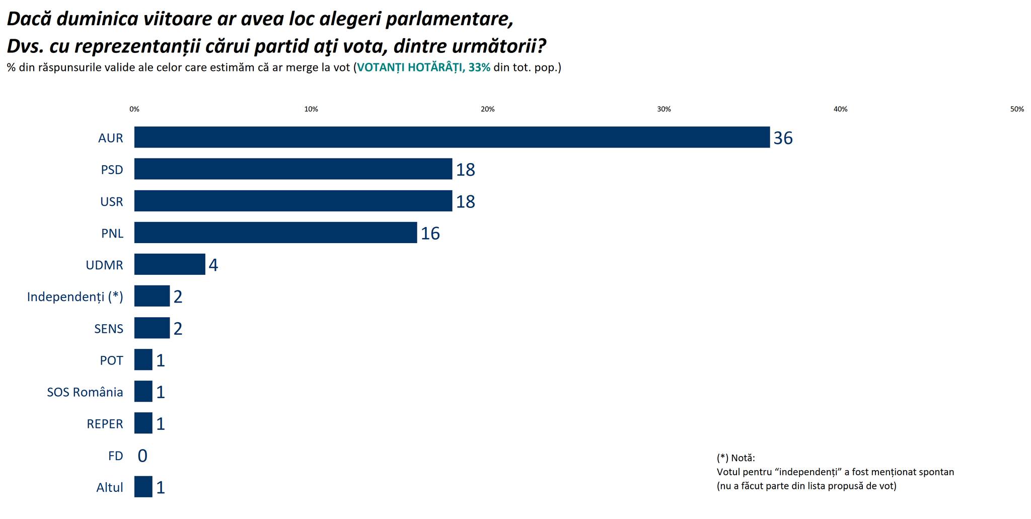Un sondaj realizat de Sociopol, în perioada 26 martie – 4 aprilie 2026, arată că AUR se menține detașat în fruntea intenție la vot, în cazul unor alegeri parlamentare.