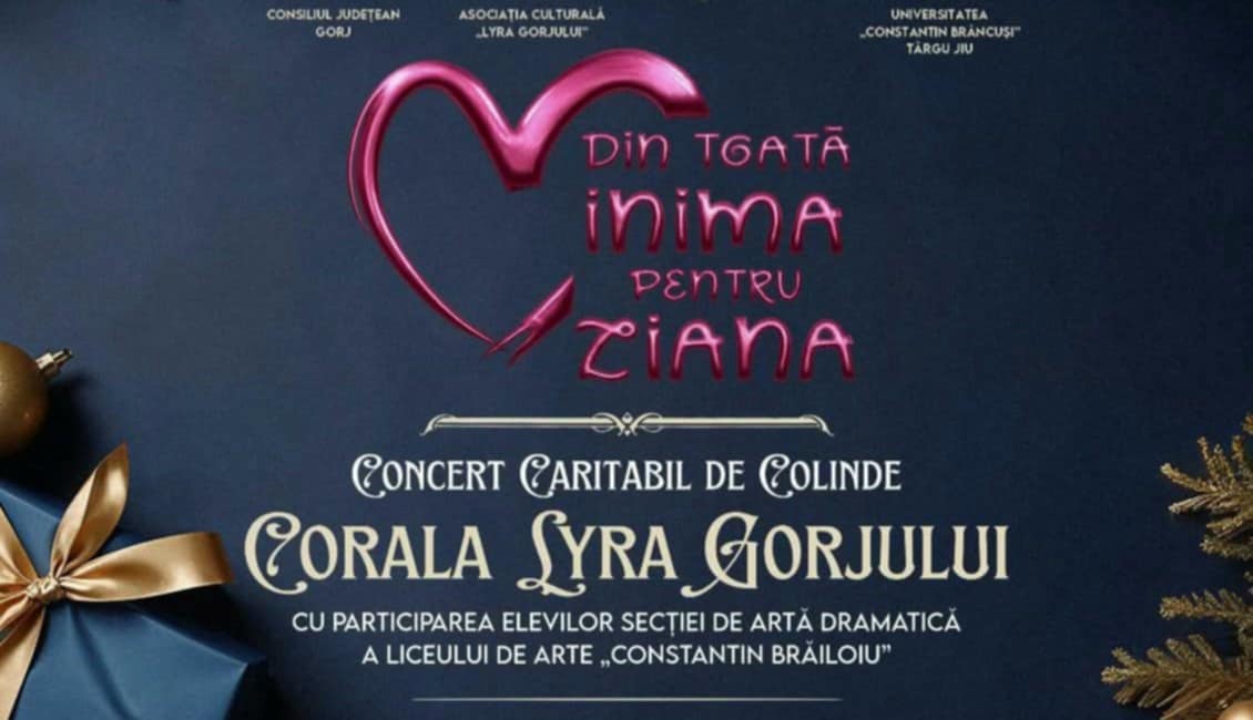 Asociația Culturală ”Lyra Gorjului” organizează joi, 11 decembrie, concertul caritabil de colinde ”Din toată inima pentru Ziana”. În program, Corala ”Lyra Gorjului”, cu participarea elevilor Secției ”Artă Dramatică” a Liceului de Arte ”Constantin Brăiloiu”. Dirijor: Florin Berculescu.