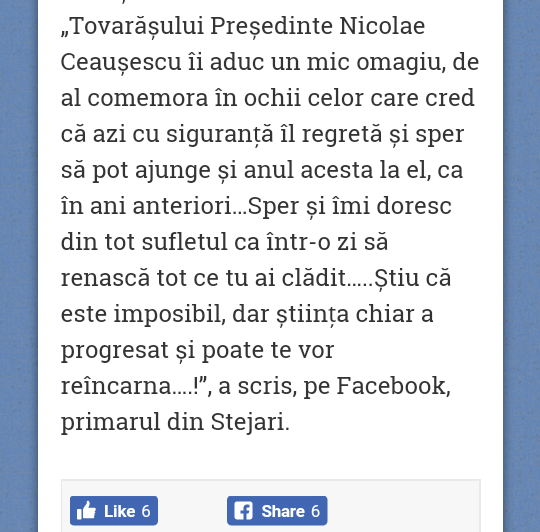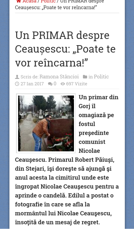 ”Tovarășului Nicolae Ceaușescu îi aduc un mic omagiu, de al comemora în ochii celor care cred că azi cu siguranță îl regretă și sper să pot ajunge și anul ăsta la el, ca în ani anteriori…Sper și îmi doresc din tot sufletul ca într-o zi să renască tot ce tu ai clădit…Știu că este imposibil, dar știința chiar a progresat și poate te vor reîncarna”, a scris, pe facebook, Robert Păiuși, la 99 de ani de la nașterea fostului președinte al Republicii Socialiste România, Nicolae Ceaușescu.