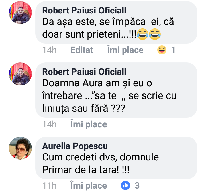 O doamnă a îndrăznit să-l corecteze pe primarul Păiuși, pe facebook, arătându-i că a rătăcit o cratimă. Replica edilului șef nu a întârziat: ”Doamna Aura am și eu o întrebare…<<să te>> se scrie cu liniuță sau fără???”